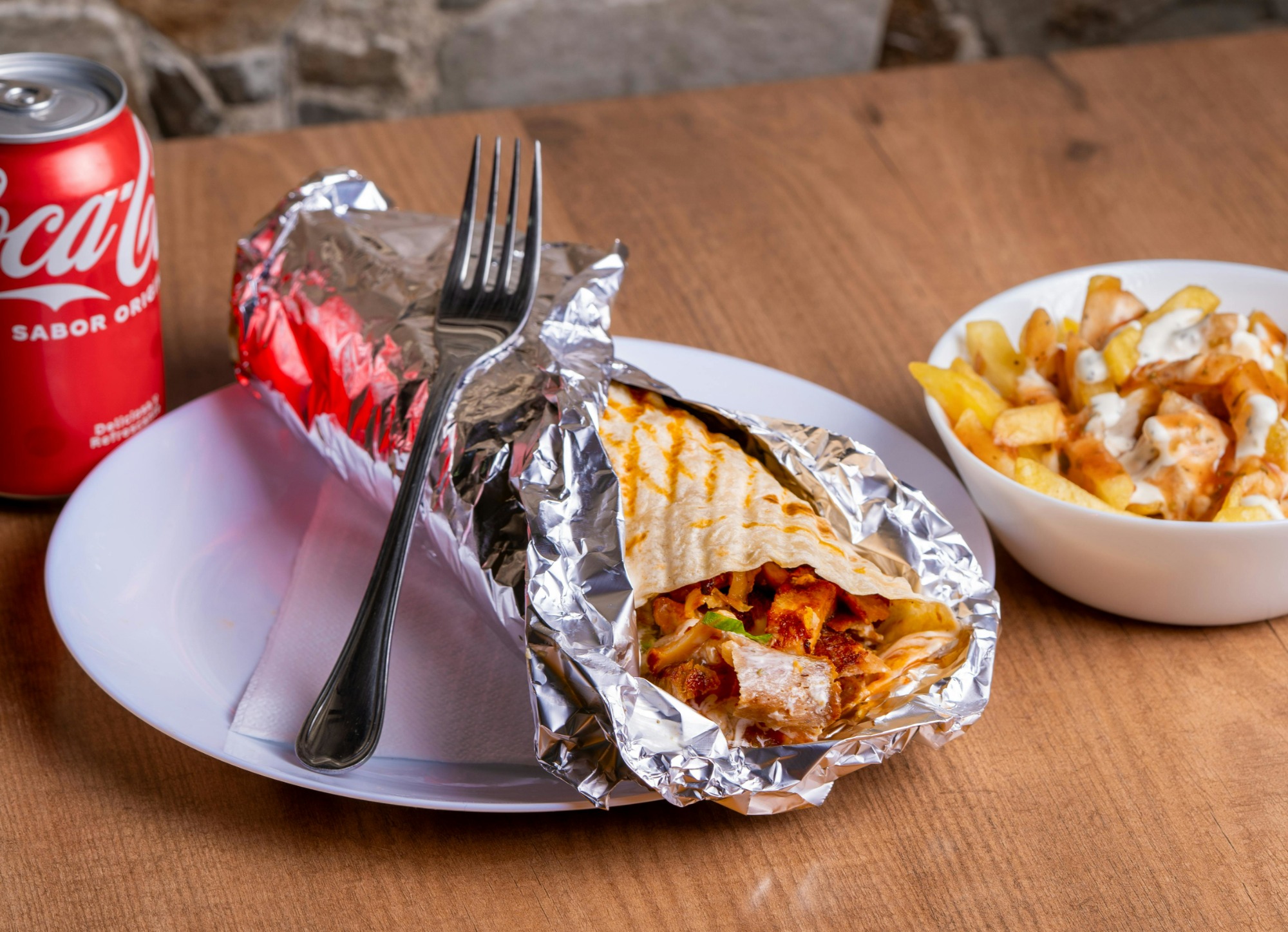mięso, frytki, sos -